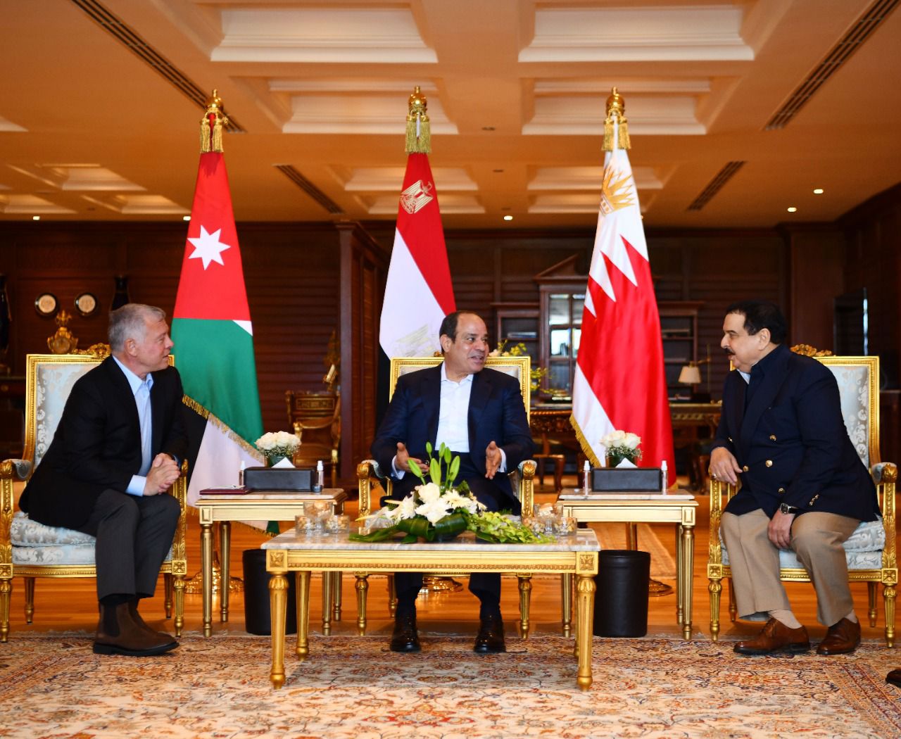 وصرح المتحدث الرسمي باسم رئاسة الجمهورية، بأن الرئيس رحب بشقيقيه البحريني والأردني ضيفين عزيزين على مصر، معرباً عن التقدير للعلاقات الوثيقة والتاريخية التي تجمع البلدان الثلاثة على المستويين الرسمي والشعبي.