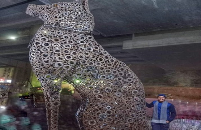 صمم الفنان الشاب إبراهيم صلاح أكبر تمثال للإلهة المصرية القديمة “باستت” على شكل قطة مصنوعة من مواد الخردة، ويبلغ طول المجسم نحو 6 أمتار بوزن 400 كيلو من الحديد.