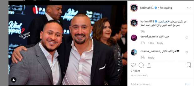 نشر الفنان كريم عفيفي صورة تجمعه بالفنان أحمد السقا عبر حسابه الشخصي إنستجرام، من تكريم مهرجان نجم العرب، الذي أقيم في أحد الفنادق الكبرى بالقاهرة.