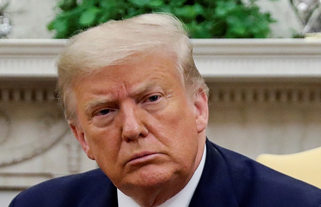 U.S. President Donald Trump listens during a meeting with family members of slain Fort Hood soldier Vanessa Guillen, who was was found dead after disappearing from the army base in Texas, in the Oval Office at the White House in Washington, U.S., July 30, 2020. REUTERS/Carlos Barria